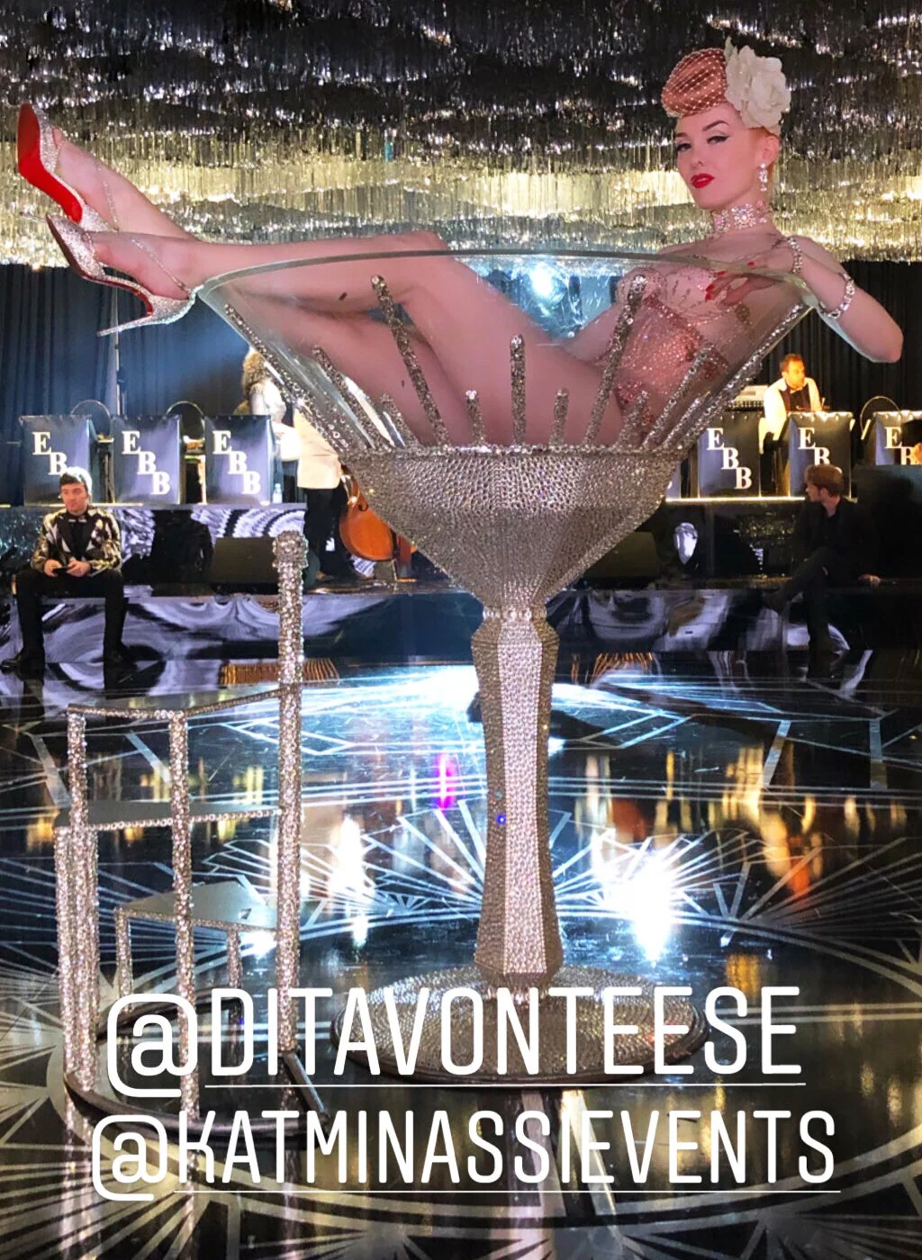 A lavish Gatsby themed wedding with Tease If You Please and Kat Minassi Events! Miranda appeared in Dita Von Teese’s legendary Swarovski crystal martini glass, flanked by glittering showgirl dancers.